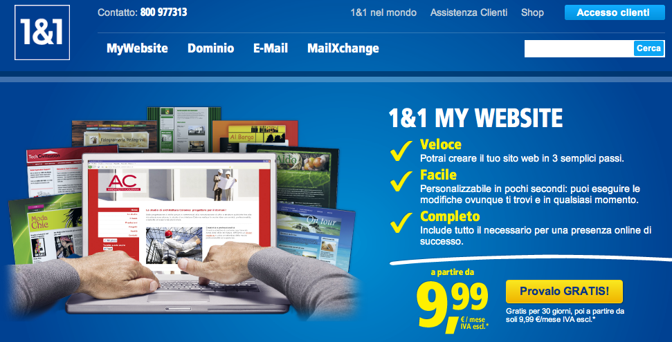 Per quanto riguarda i costi del servizio My Website su 1&1, questi risultano molto contenuti, infatti per la creazione e gestione di un sito web il prezzo è di soli 9,99€ iva esclusa al mese, davvero conveniente se pensiamo al fatto che non dobbiamo occuparci di nulla, ma solo di riempire il sito dei contenuti che desideriamo, a tutto il resto ci pensa 1&1.it, inoltre i primi 30 giorni di prova sono assolutamente gratuiti.