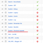 Ora, per effettuare l’aggiornamento con jUpgrade abilitate il plugin System – Mootools Upgrade, come mostrato nell’immagine seguente: