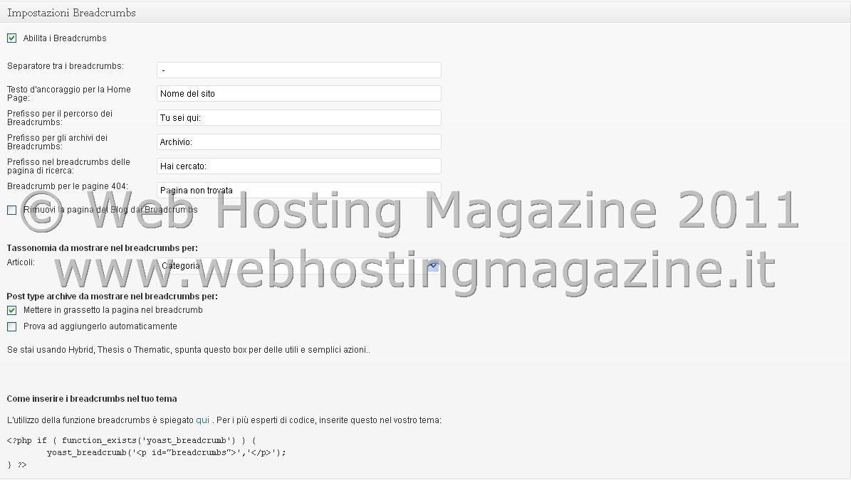Coloro che vogliono, possono attivare questa funzione e procedere successivamente, all’inserimento del codice per mostrare i Breadcrumbs nel proprio blog. L’inserimento può essere automatico a seconda del tipo di tema o framework utilizzato, oppure manuale, facendo riferimento a questa pagina.