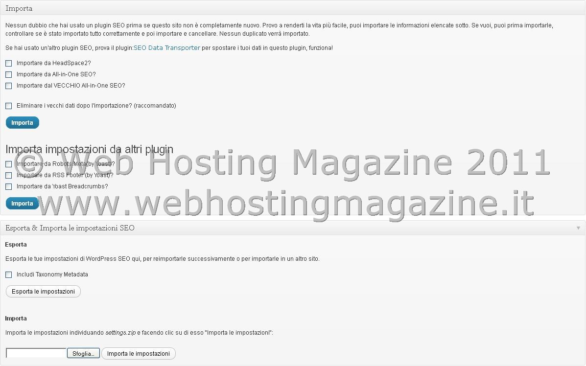 Tramite questa opzione è possibile importare i dati e le impostazioni da altri plugin SEO, HeadSpace, All in SEO. Oppure, esportare le vostre impostazioni, salvarle in un file e reimportarle successivamente in un altro sito.